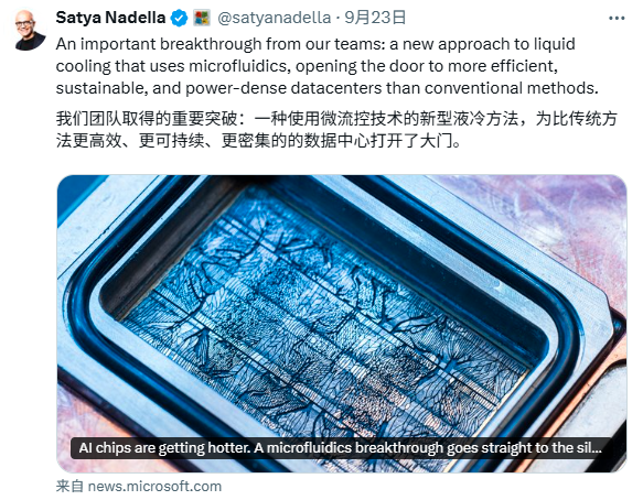 Microsoft President and CEO Satya Nadella announced on social media that the Microsoft team has achieved a significant breakthrough: a novel liquid cooling method utilizing microfluidic technology, which paves the way for more efficient, sustainable, and denser data centers than traditional approaches.
